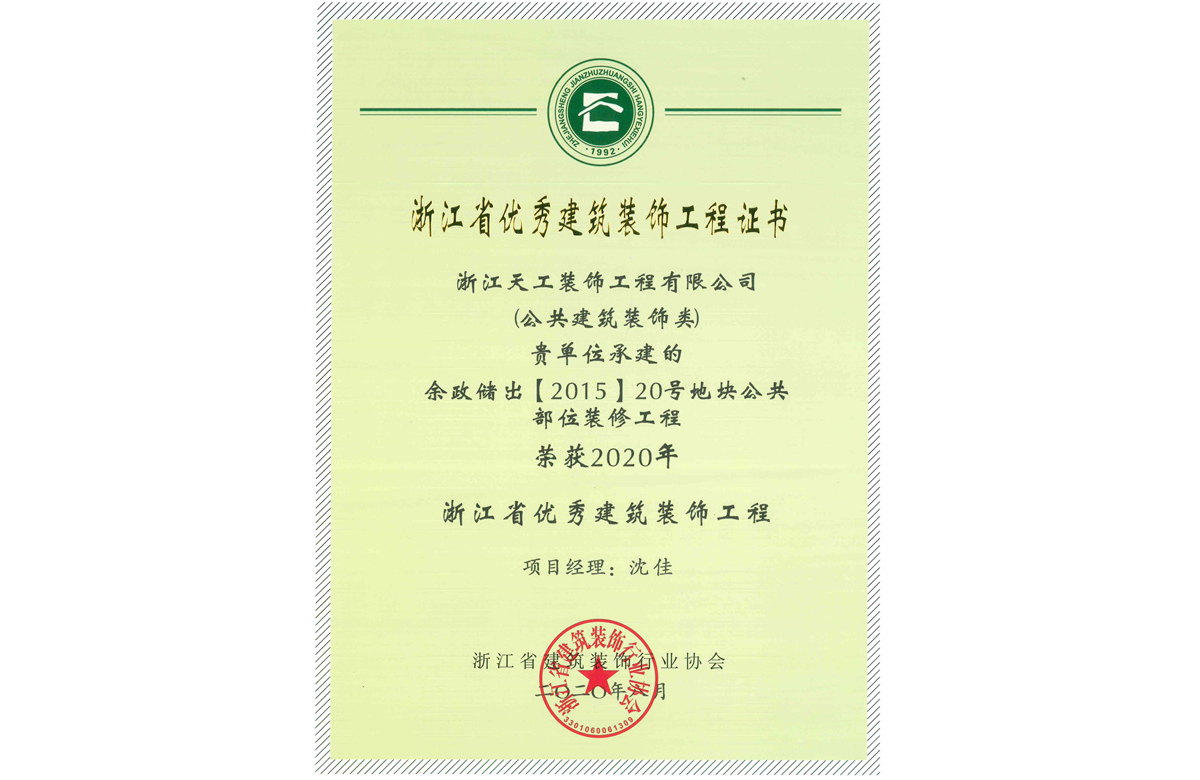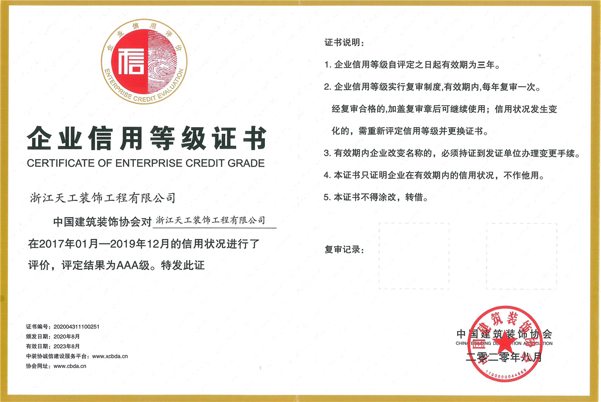 浙江天工裝飾工程有限公司成立于1994年,是一家專注于建筑行業(yè)近三十年,余杭區(qū)內(nèi)規(guī)模最大、最專業(yè)的現(xiàn)代化專業(yè)承包企業(yè),連續(xù)十二年榮獲“余杭區(qū)建筑業(yè)十強(qiáng)企業(yè)”稱號(hào)。公司現(xiàn)任余杭區(qū)建筑裝飾行業(yè)協(xié)會(huì)會(huì)長(zhǎng)單位、杭州市建筑裝飾行業(yè)協(xié)會(huì)副會(huì)長(zhǎng)單位、浙江省建筑裝飾行業(yè)協(xié)會(huì)副會(huì)長(zhǎng)單位、中國建筑裝飾協(xié)會(huì)理事單位。公司具備建筑裝修裝飾工程專業(yè)承包壹級(jí)、建筑幕墻工程專業(yè)承包壹級(jí)、建筑裝飾工程設(shè)計(jì)專項(xiàng)甲級(jí)、建筑幕墻工程設(shè)計(jì)專項(xiàng)甲級(jí)、展覽陳列工程設(shè)計(jì)施工一體化貳級(jí)、電子與智能化工程專業(yè)承包貳級(jí)、消防設(shè)施工程專業(yè)承包貳級(jí)、防水防腐保溫工程專業(yè)承包貳級(jí),集建筑工程施工總承包、建筑機(jī)電安裝、城市及道路照明、鋼結(jié)構(gòu)、結(jié)構(gòu)補(bǔ)強(qiáng)、安防施工等多項(xiàng)資質(zhì)。主要從事大型公共建筑、星級(jí)酒店的室內(nèi)精裝修、建筑幕墻及建筑智能化工程的設(shè)計(jì)與施工。 天工裝飾始終把建筑裝飾當(dāng)作一項(xiàng) “美的事業(yè)”,在施工中嚴(yán)把質(zhì)量關(guān),不斷規(guī)范和提升工程技術(shù)標(biāo)準(zhǔn)。近年來,公司承建的浙商開元名都國際酒店I標(biāo)段裝飾工程、杭州藝尚雷迪森廣場(chǎng)酒店裝修工程、余杭區(qū)時(shí)代廣場(chǎng)5號(hào)樓(市民之家)室內(nèi)裝飾工程、永安之星室內(nèi)裝飾工程、青山湖科技城創(chuàng)業(yè)廣場(chǎng)裝修工程、杭州未來科技城醫(yī)院室內(nèi)裝飾工程、杭州師范大學(xué)附屬實(shí)驗(yàn)學(xué)校裝修工程、杭州老板電器股份有限公司辦公樓裝飾工程、深川控股集團(tuán)綜合樓幕墻工程、浙江省科技信息研究院幕墻工程、北航杭州創(chuàng)新研究院(余杭)內(nèi)裝及智能化提升改造項(xiàng)目(研究生院)工程、臨平新城人才服務(wù)中心設(shè)計(jì)釆購施工(EPC)工程總承包項(xiàng)目、浙江大學(xué)先進(jìn)電氣裝備創(chuàng)新中心室內(nèi)外裝飾及改造項(xiàng)目設(shè)計(jì)采購施工(EPC)工程總承包項(xiàng)目等,先后獲得“中國建筑工程裝飾獎(jiǎng)”、“全國建筑裝飾科技創(chuàng)新獎(jiǎng)”、浙江省建設(shè)工程“錢江杯”優(yōu)質(zhì)工程獎(jiǎng)、杭州市建設(shè)工程“西湖杯”優(yōu)質(zhì)工程獎(jiǎng)、嘉興市建設(shè)工程“南湖杯”優(yōu)質(zhì)工程獎(jiǎng)、“浙江省優(yōu)秀建筑裝飾工程獎(jiǎng)”、“浙江省優(yōu)質(zhì)安裝質(zhì)量獎(jiǎng)”等榮譽(yù)。 天工裝飾恪守“誠實(shí)守信、文明經(jīng)營”,近年來公司得到了客戶的信賴也獲得了業(yè)界的好評(píng),先后被評(píng)為“國家級(jí)守合同重信用單位”、“全國建筑裝飾行業(yè)AAA級(jí)信用企業(yè)”、“全國百家科技創(chuàng)新型企業(yè)”、“浙江省AAA級(jí)守合同重信用單位”、“人民銀行信用等級(jí)AAA級(jí)企業(yè)”、“浙江省信用管理示范企業(yè)”、“浙江省誠信企業(yè)”、“浙江省建筑裝飾行業(yè)強(qiáng)優(yōu)企業(yè)”、“杭州市建筑業(yè)優(yōu)秀企業(yè)”、“余杭區(qū)建筑業(yè)十強(qiáng)企業(yè)”、 “余杭區(qū)人民政府質(zhì)量獎(jiǎng)”等榮譽(yù)。